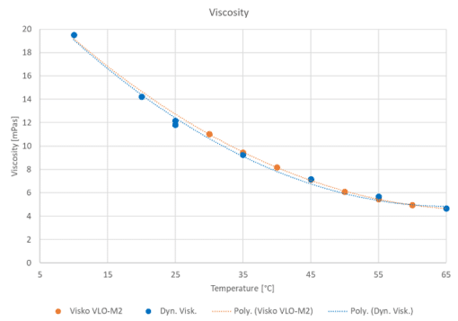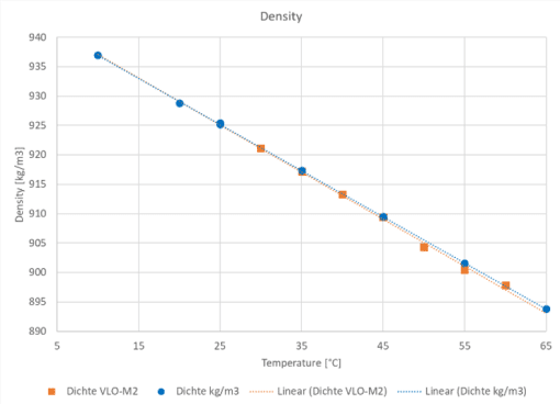 Die Messergebnisse der Dichtemessung sind in Abbildung 1 dargestellt. Die blauen Kreise, sowie die lineare Trendkurve dieser Messwerte, zeigen die Messergebnisse der Laboranalyse. Diese wurden mit dem Labormessgerät DSA 5000 M von Anton Paar ermittelt. Die in orange dargestellten Quadrate und ihre Trendlinie zeigen die mittels Viskositätssensor VLO-M2 aufgezeichneten Messwerte. Über den gesamten Temperaturbereich ist eine lineare Veränderung der Dichte zu erkennen.
