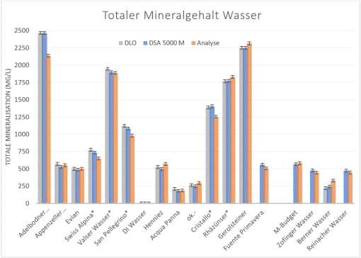 Abbildung 1: Mineralstoffgehalt verschiedener Wasser. Orange Balken stehen für die Laboranalyse, graue und blaue Balken für die Mineralstoffgehalte basierend auf Dichtemessungen mit dem DLO-M2 respektive dem DSA 5000 M